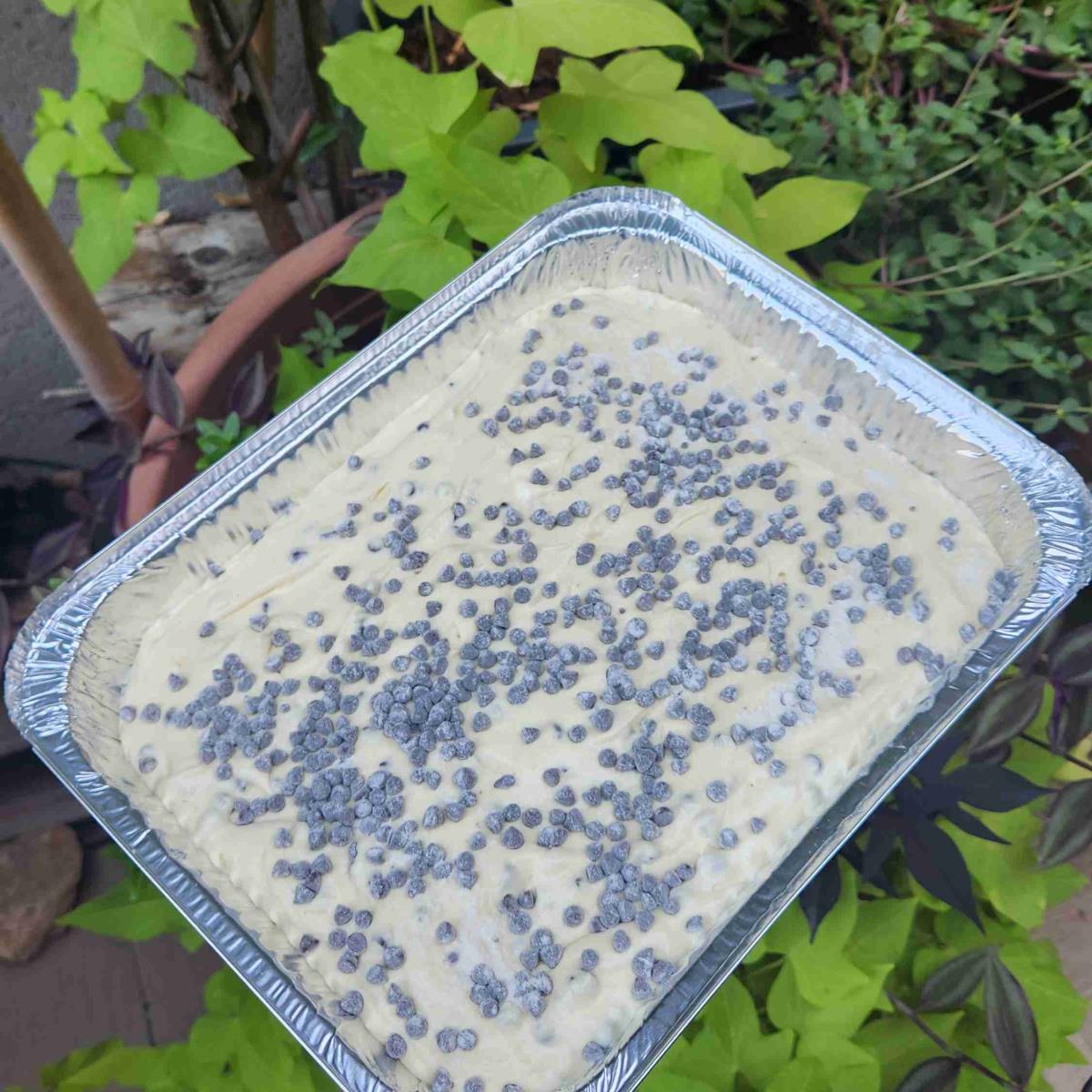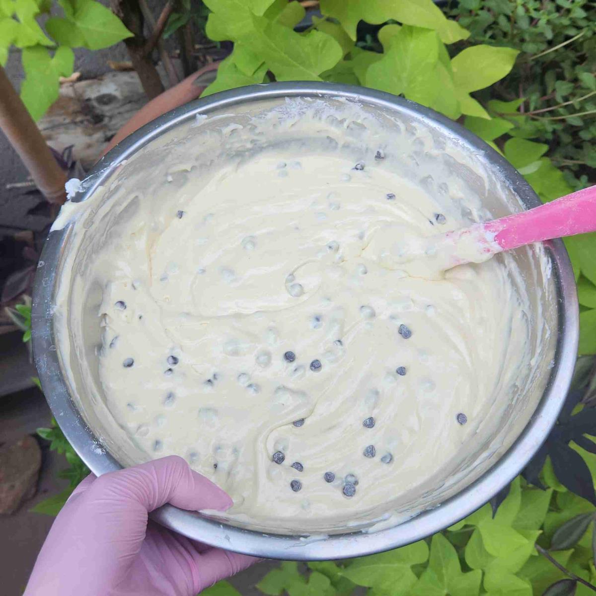 בזמן שהביצים במיקסר, לערבב את החלמונים (צהוב) יחד עם הסוכר, סוכר וניל, ריץ, ועם שאר המרכיבים ולבסוף את את הקמח יחד עם אבקת אפייה. לערבב בקערה נפרדת את השוקולד צ'יפס עם כף קמח, לערבב היטב שכל השוקולד יהיה עם קמח. להניח בצד לבנתיים, להעביר מהמרנג הלבן הקצפת הביצים לבלילה של העוגה בתנועות קיפול בעדינות, ולבסוף להוסיף את השוקולד ציפס שמעורבב עם קמח, את שאריות הקמח אין צורך להוסיף, לערבב בתנועות קיפול שוב בעדינות ולהעביר לתבנית אפייה. .