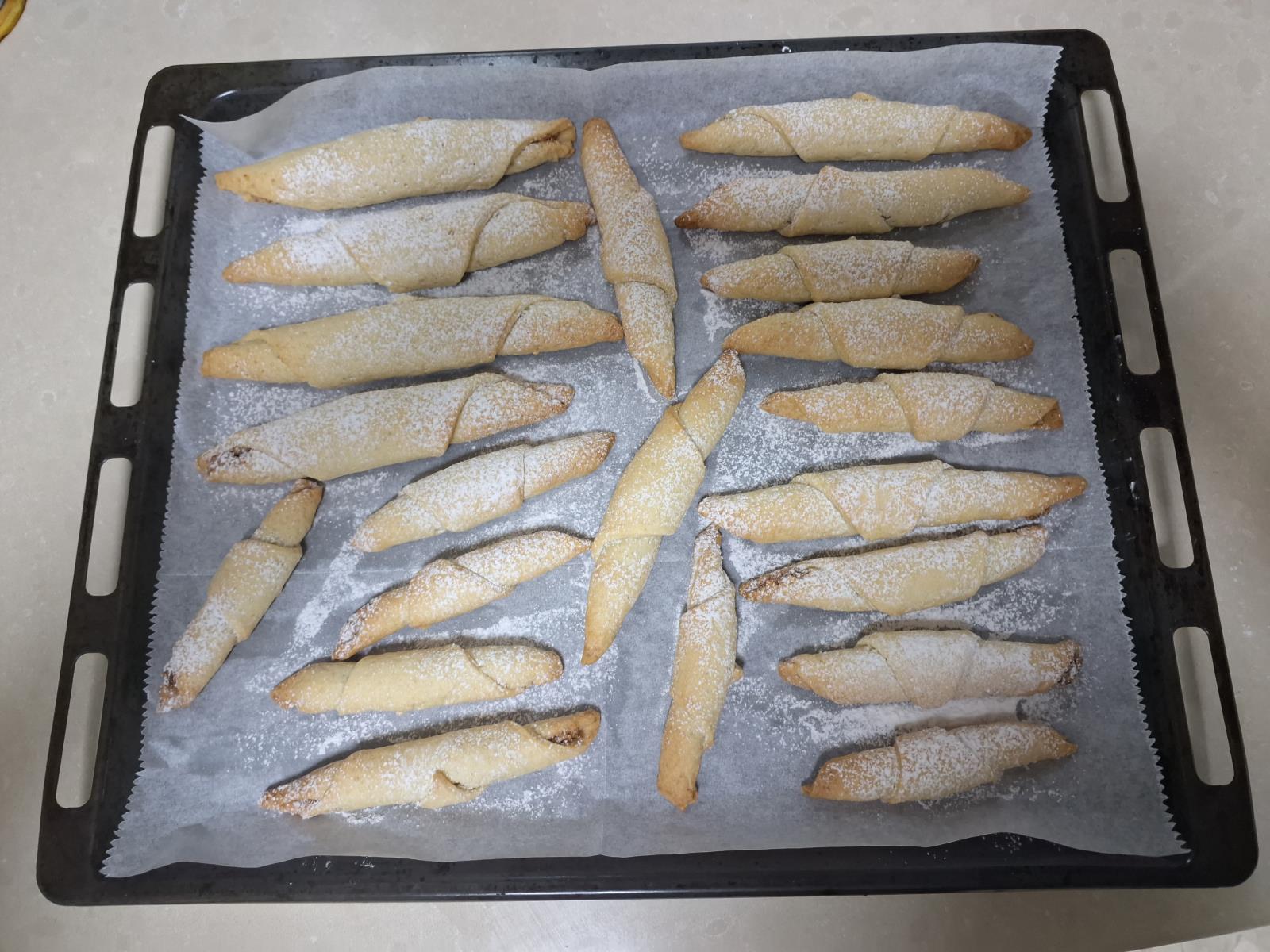 מחלקים את הבצק לארבעה חלקים, מרדדים כל חלק לעיגול. מניחים מכסה סיר במרכז, חותכים את השוליים העודפים (ומה שעודף שומרים בצד כי בסוף מאחדים את כל השאריות, יוצרים מהן חלק חמישי וניתן גם ממנו לרדד ולהכין עוגיות נוספות) ופורסים את העיגול למשולשים. מורחים שכבה מהמילוי בקצה הרחב ומגלגלים לרולדות. .