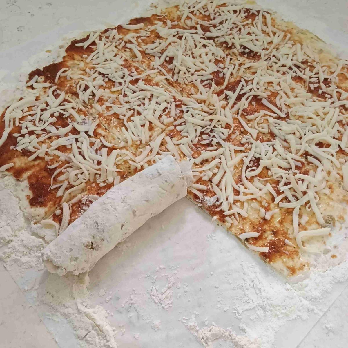 4. ככה נעשה גם עם הכדור השני של הבצק, נרדד לעלה, נחלק ל5-6 חלקים, רק במקום שמן זית אפשר למרוח רסק עגבניות טעים וממעל מוצרלה.