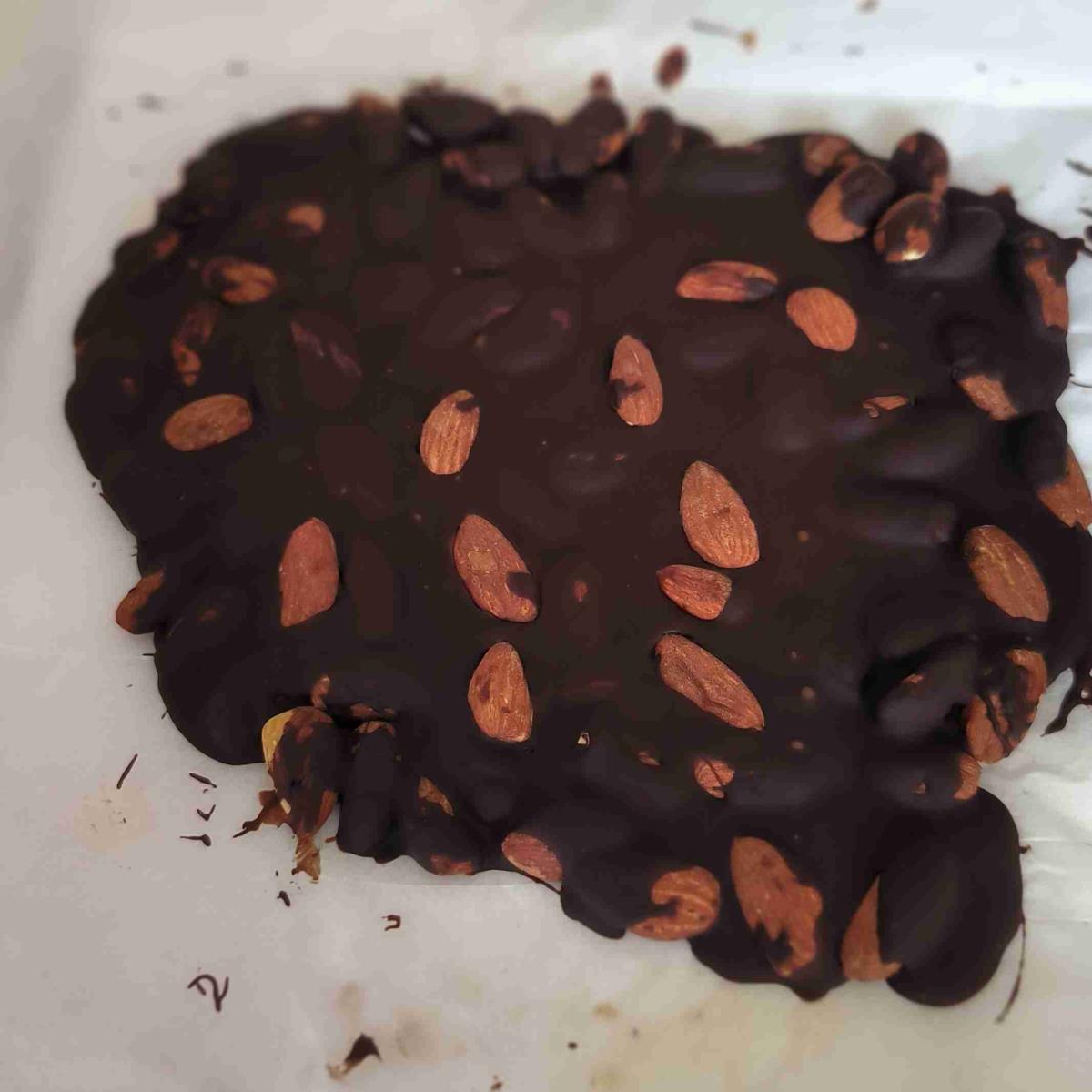 שופכים את השוקולד המומס בצורה אחידה ודקה (כס"מ עובי), מניחים מעל את יתרת השקדים.