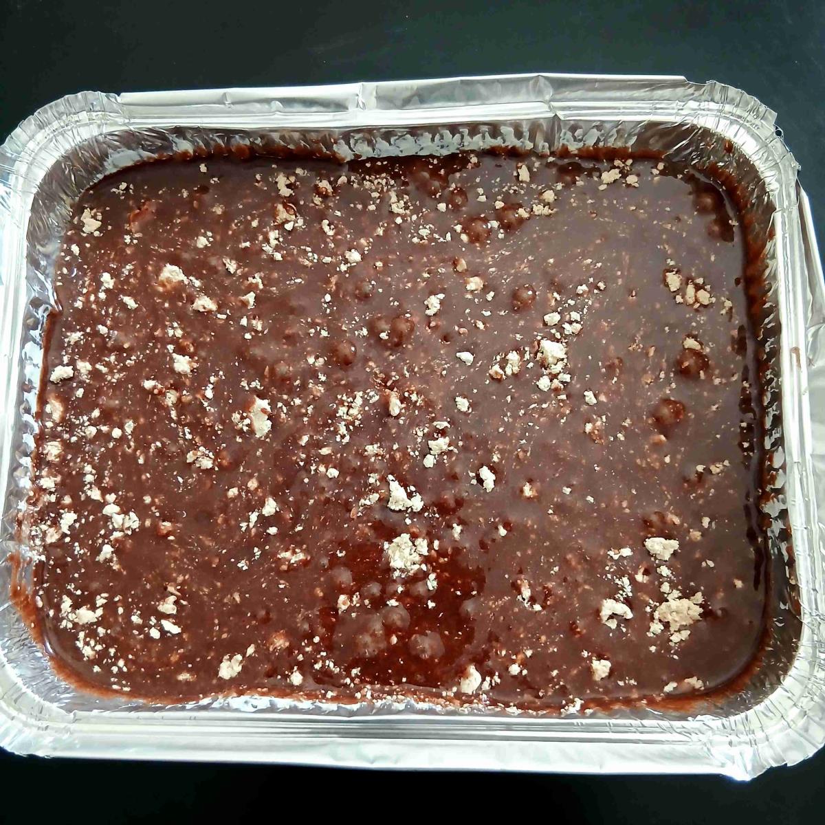 להוסיף אבקת אפיה ומלח ולערבב. להוסיף קקאו ולערבב. להוסיף קמח ולערבב עד לקבלת בלילה אחידה. להעביר לתבנית..