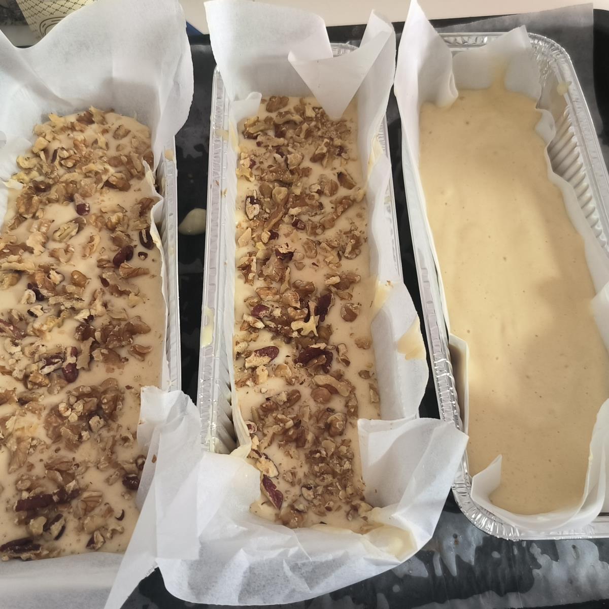 מוסיפים את הקמח (ואבקת האפייה), שופכים לתבניות ומעל מניחים את האגוזים ומכניסים לתנור שחומם מראש ל-180 מעלות. .