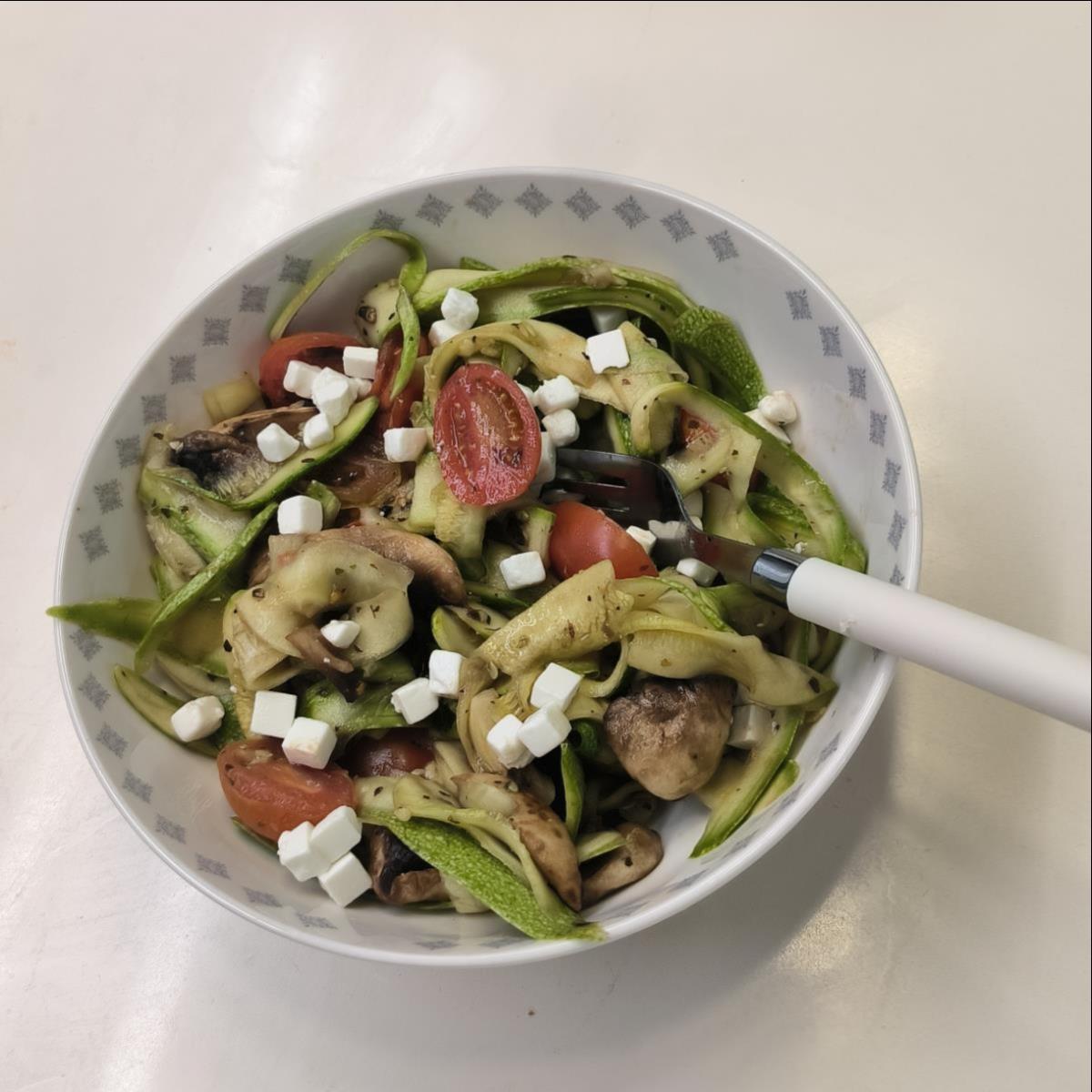 לחמם 3 כפות שמן זית במחבת נון-סטיק, להכניס את העגבניות והפטריות, לאחר דקה להוסיף את השום, לאחר דקה להוסיף את רצועות הקישואים/זוקיני, חום בינוני.
