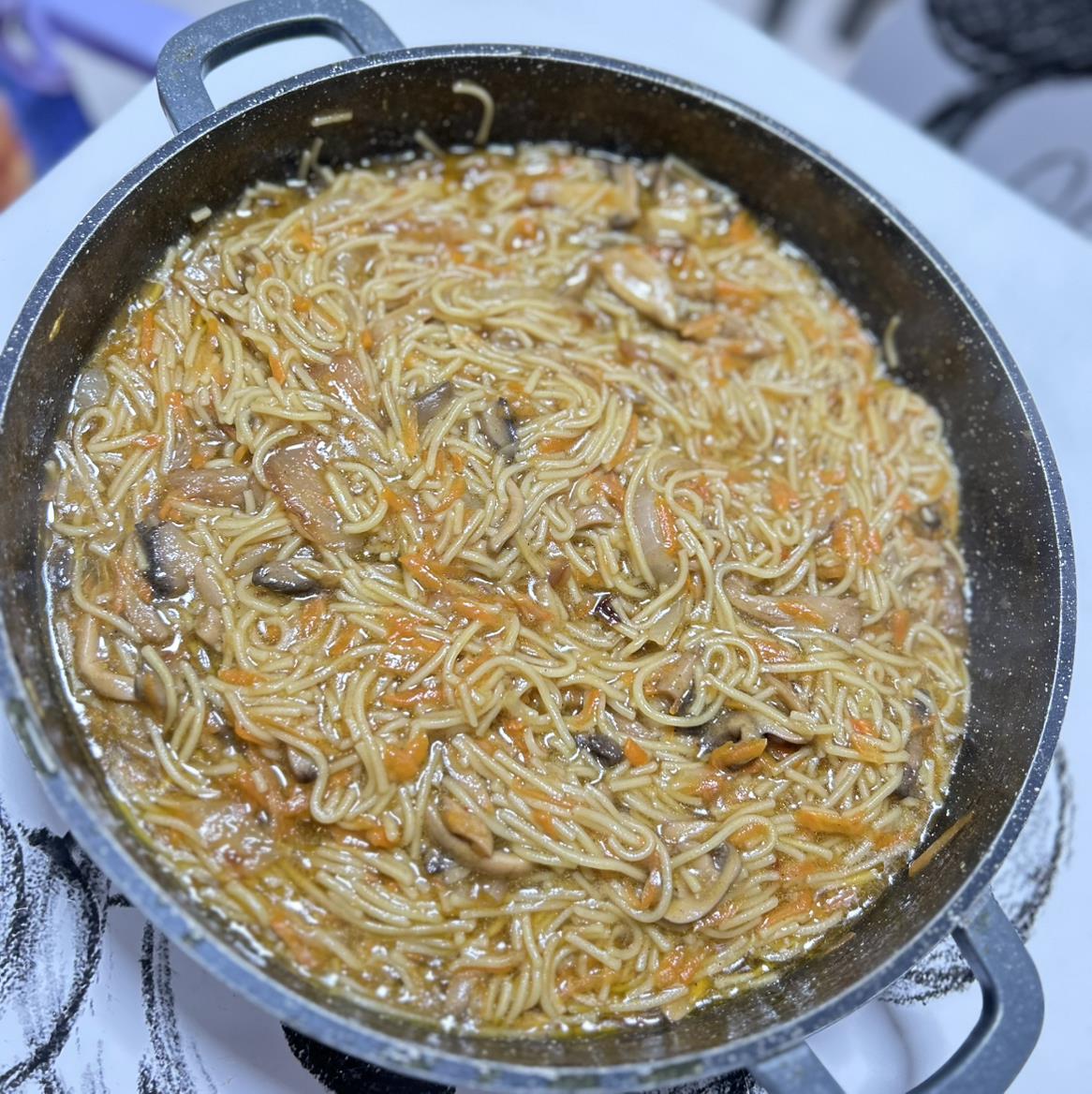 מוסיפים את הגזרים והקישוא שקילפנו וגירדנו מערבבים טוב טוב מוסיפים את האיטריות מתבלים ומוסיפים מים עד לכיסוי האטריות..