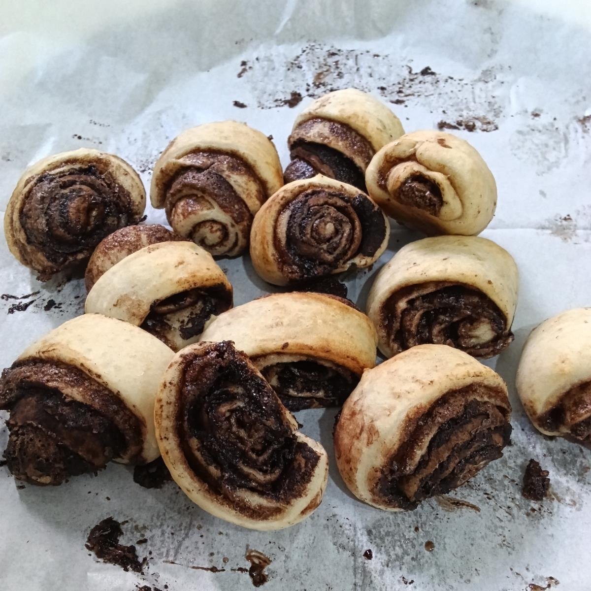 מגלגלים, מהדקים את הסוף כמה שאפשר חותכים לחתיכות(זה תופח אז אל תגזימי בגודל) ומסדרים בתבנית.