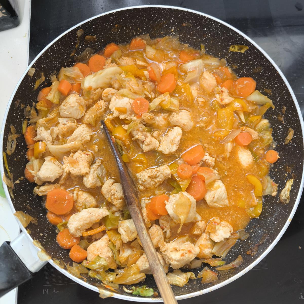 במחבת נון-סטיק נפרדת לצרוב את קוביות פילה העוף כ-4-5 דקות משני הצדדים עד שינוי צבע. להעביר את פילה העוף למחבת עם הירקות, להוסיף כוס מים (עד כוס וחצי) ולבשל על אש בינונית כעשר דקות. .