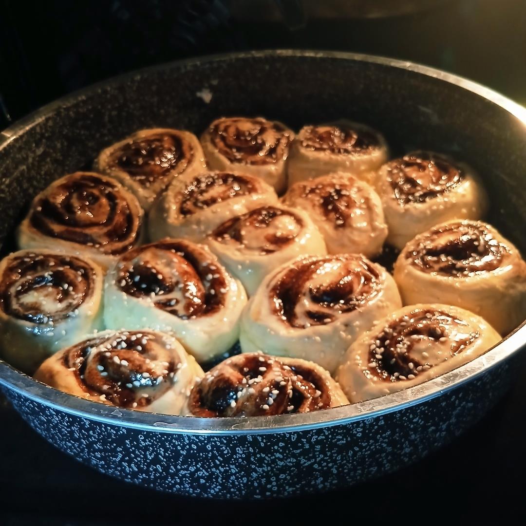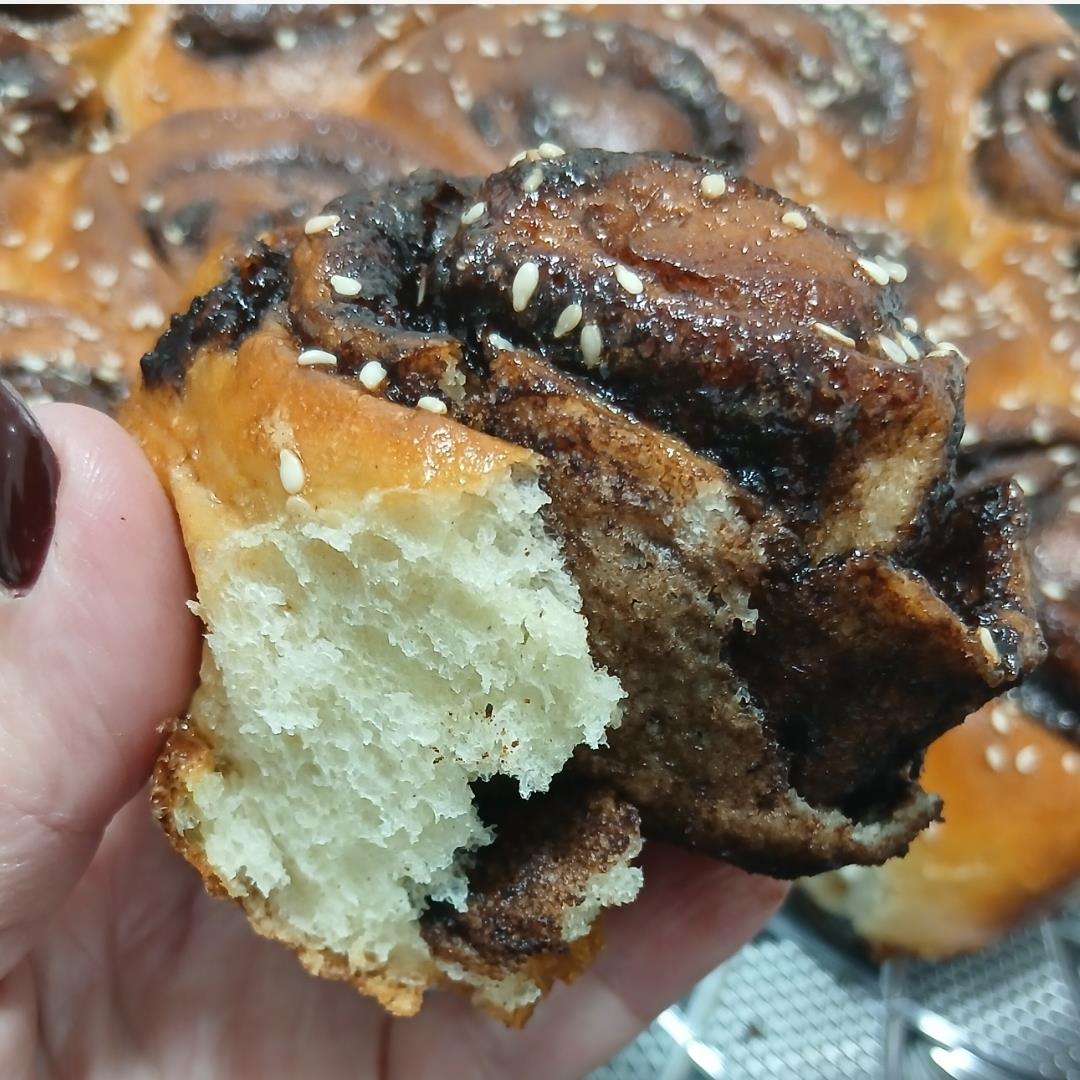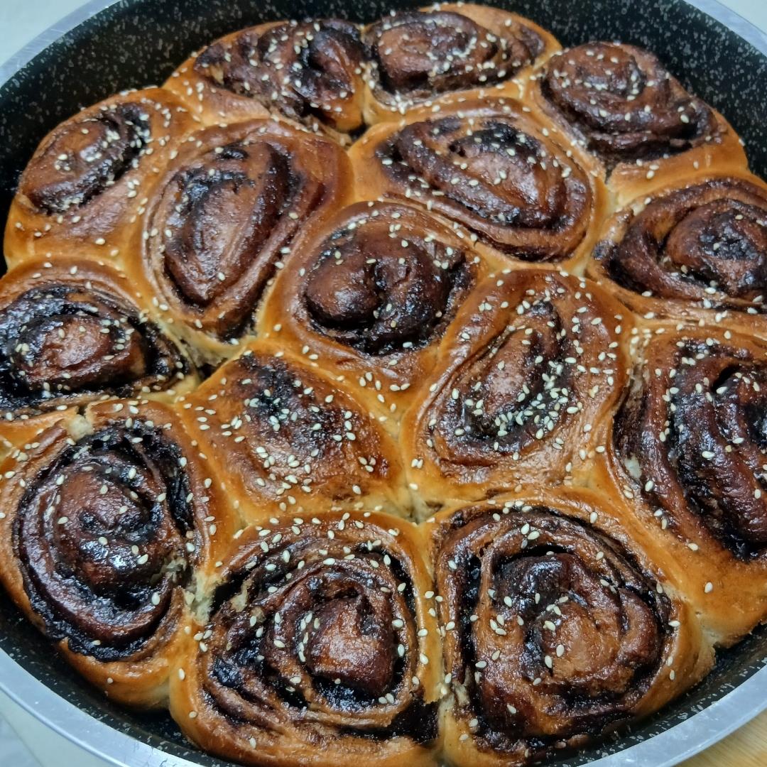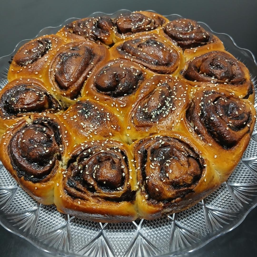 לגלגל מהצד הארוך לצורת רולדה ולהדק היטב. לחתוך לפרוסות די עבות ולהניח במירווחים קטנים בתבנית משומנת היטב. ליפתוח את הבצק לצורת שושנים. לכסות ולהתפיח עוד כחצי שעה או יותר. בקיץ תופח מהר יותר..