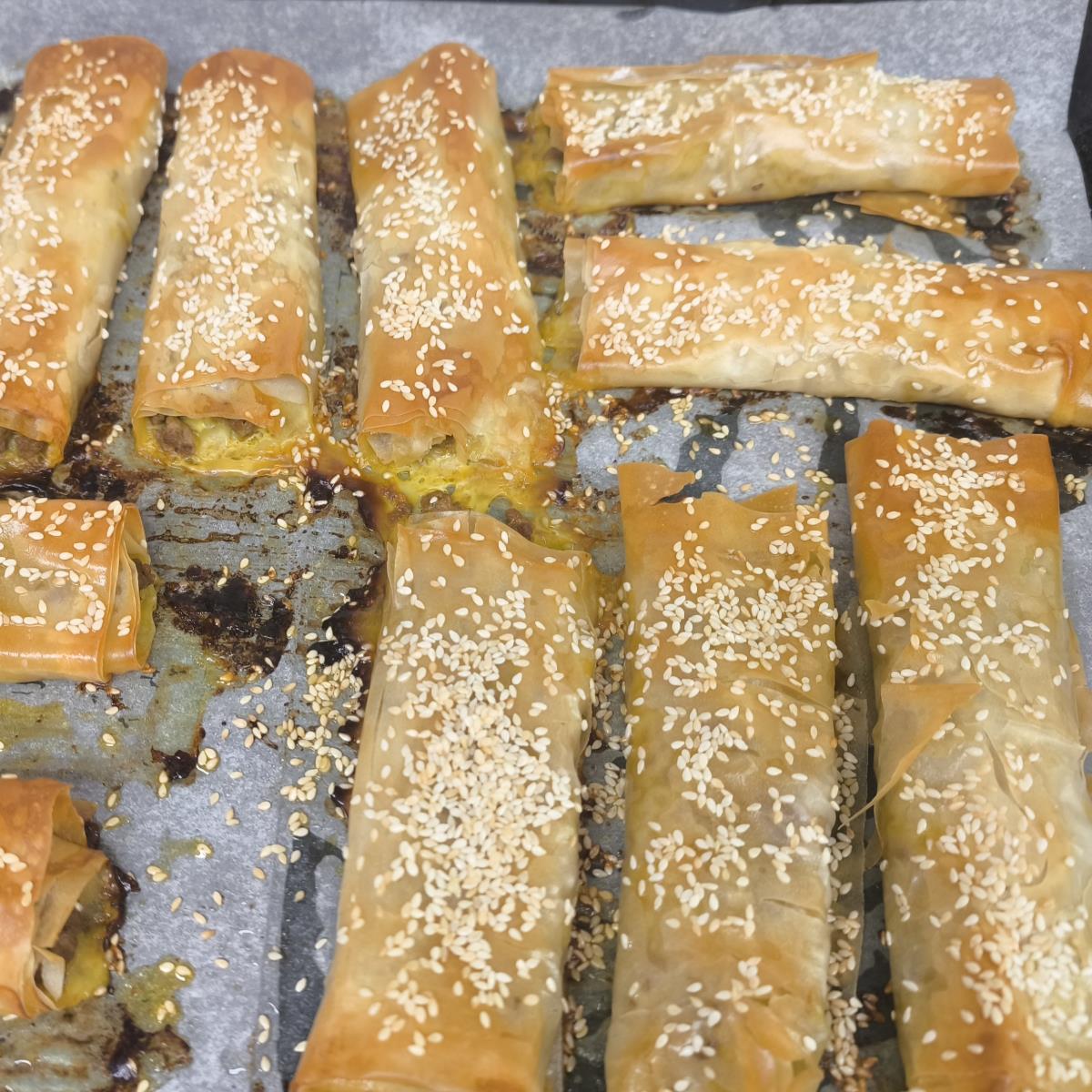 למלא את בצק הפילו באיזו צורה שרוצים - אני בחרתי בצורה הכי קלה. עשיתי זאת משני דפים שחילקתי ל-3 וכל שליש כפול מילאתי וגלגלתי..