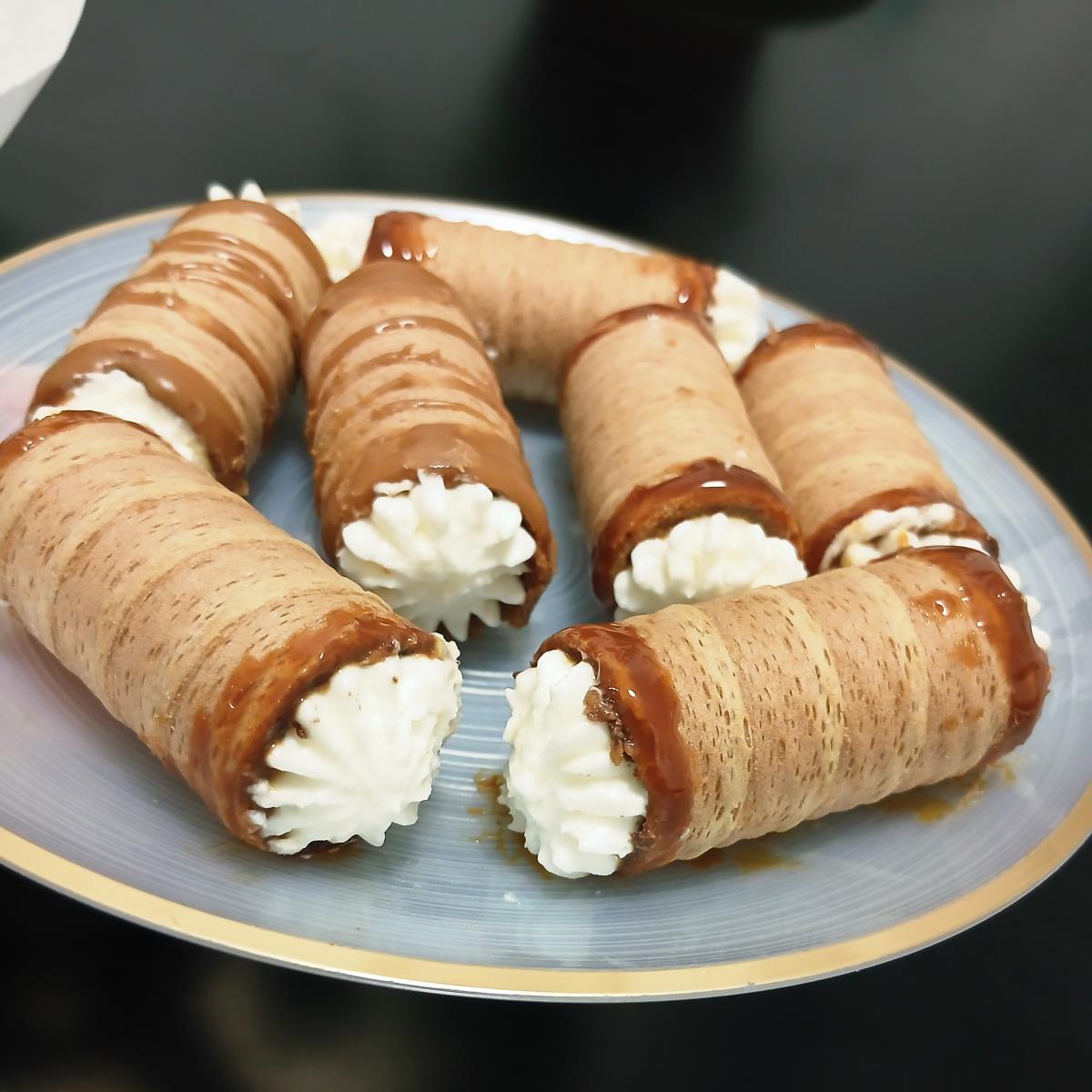 לשים כמות קטנה אחד מהציפויים בקערית קטנה. אני טבלתי בריבת חלב נוזלית ולוטוס נוזלי בשתי קעריות. ליטבול את הגליליות בקצוות משני הצדדים ולהניח על נייר אפיה. בקיץ מומלץ לשים במקפיא עד שמכינים את הקרם..