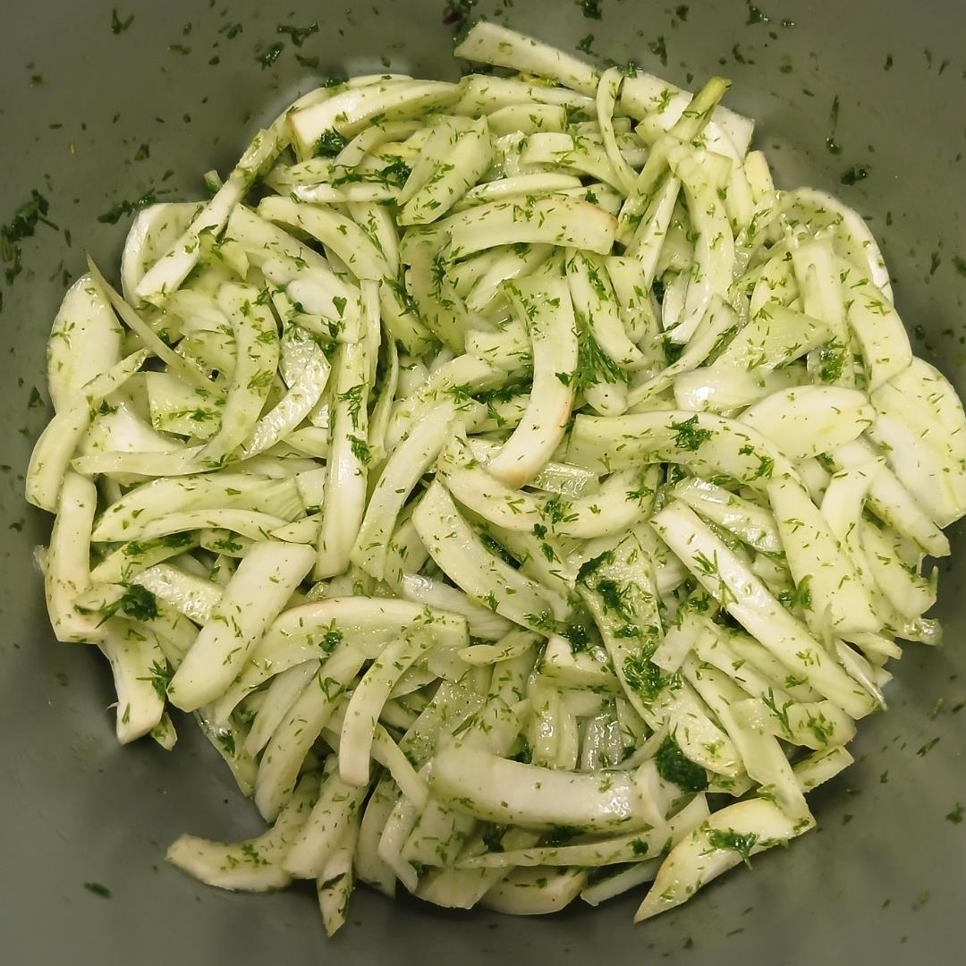 לקלף את הקולורבי. לחתוך לפרוסות וכל פרוסה לרצועות דקות. להעביר לקערה..