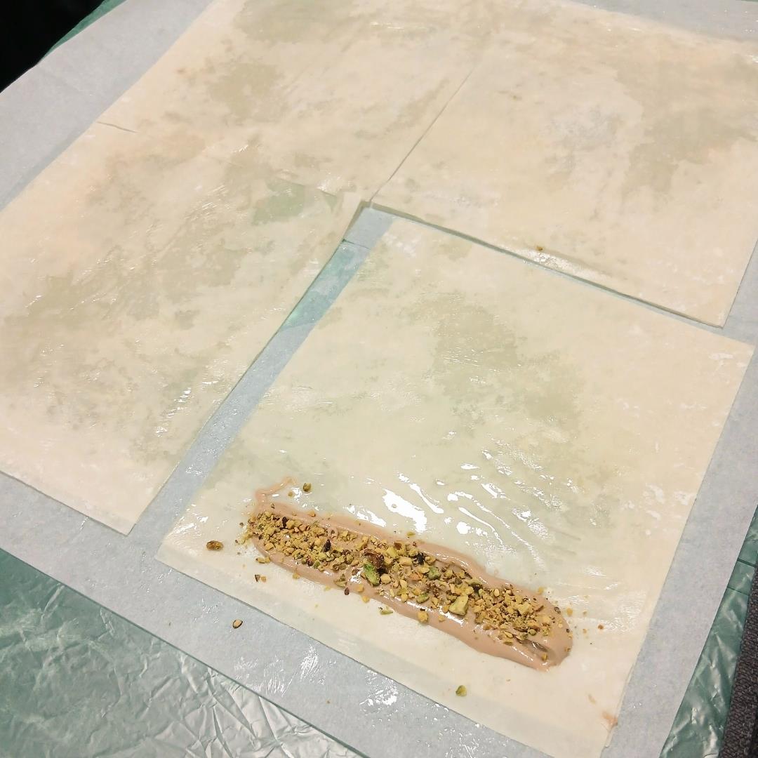 למרוח על החלק התחתון של העלה ממרח חלווה ולפזר פיסטוק גרוס. לקפל שני קיפולים על המלית, לקפל את שתי הקצוות ולהמשיך לגלגל לצורת סיגר..