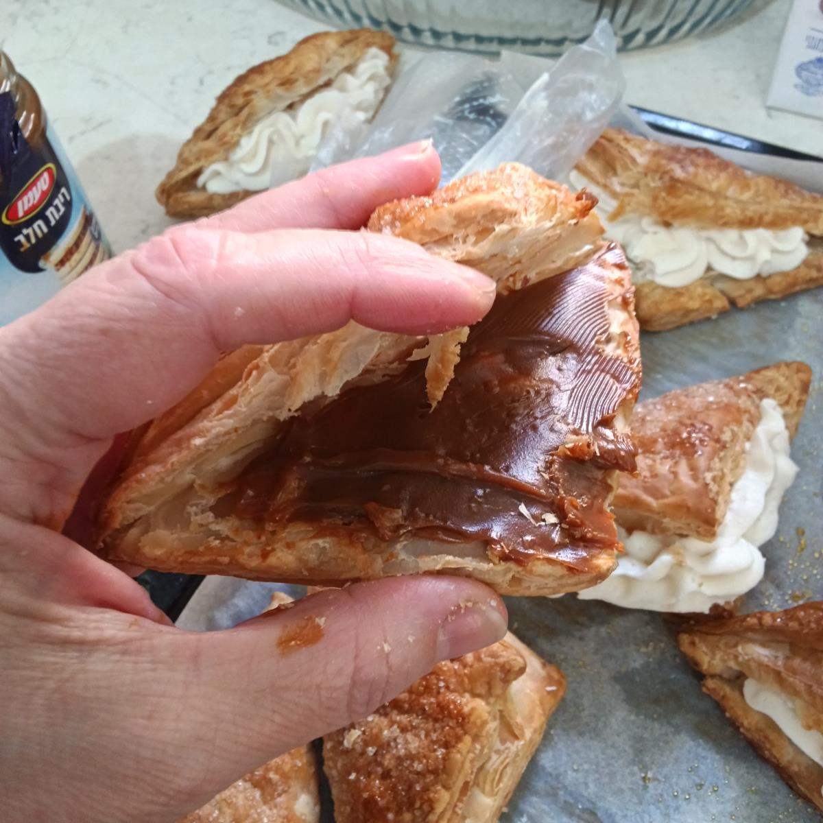 אני מרחתי שכבה דקה של ריבת חלב(שלא יהיה מדי עמוס ומתוק)
