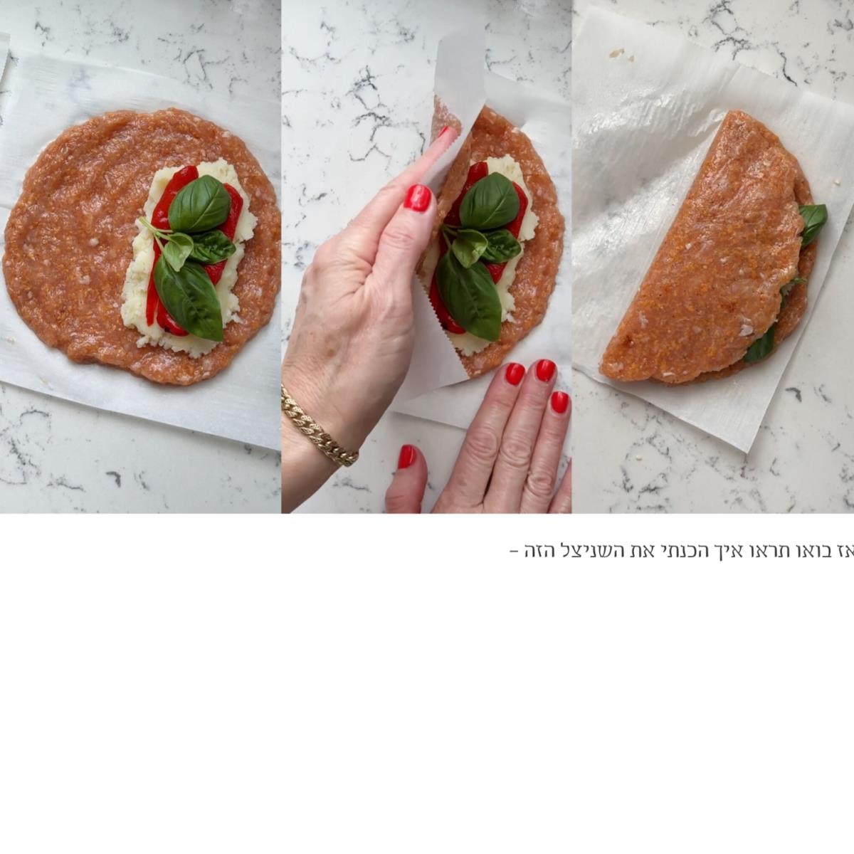מניחים פלפלים קלויים ובזיליקום וסוגרים (כמו בסרטון)