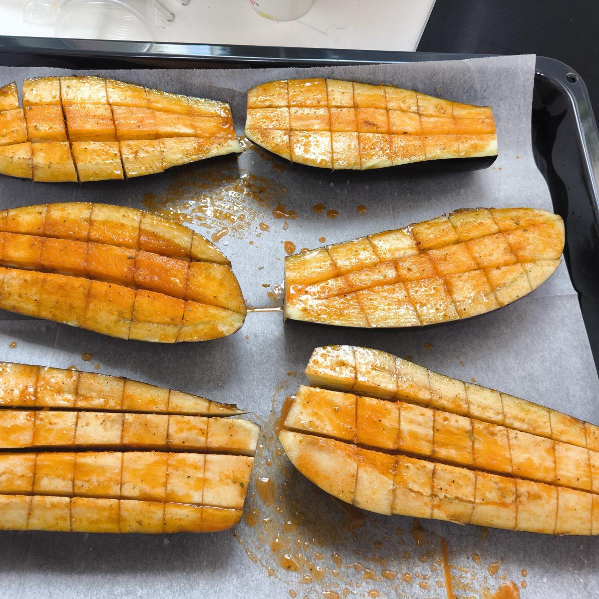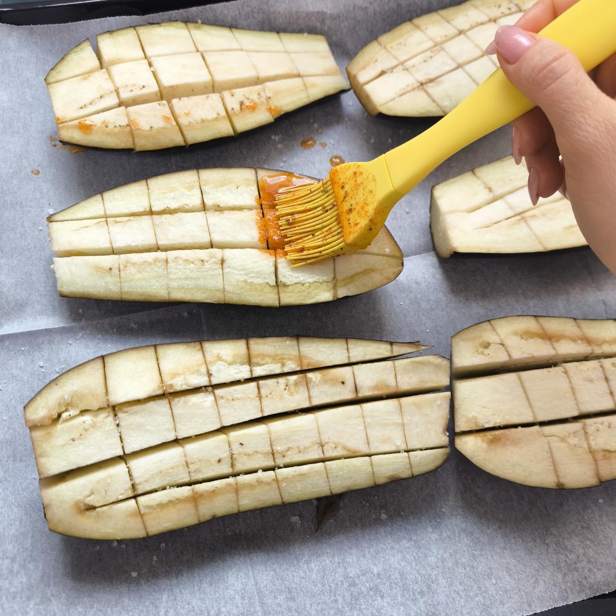 חוצים את החצילים, מסמנים בסכין שתי וערב לא עד הסוף, בקערה מערבבים את התיבול, מברישים את החצילים היטב.