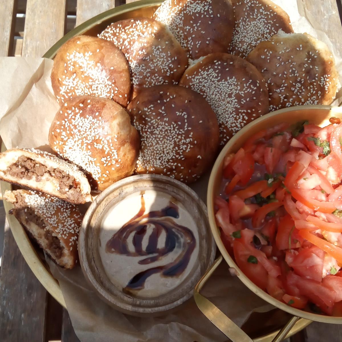 לערבב היטב להוסיף מים בהדרגה עד לקבלת בצק טיפה דביק, ואחכ חצי כוס שמן בהדרגה לקבלת בצק מושלם. להתפיח שעה ואז כל כדור לפתוח עם טיפה שמן ולמלא בבשר.