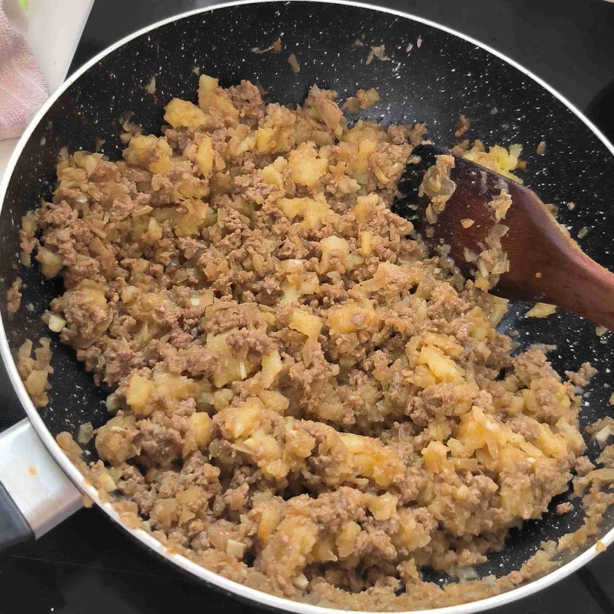 להוסיף לבצל המטוגן את הבשר/חזה עוף הטחון, לערבב ולהוסיף מלח, פלפל, רוטב צ'ילי, כמון וגריל עוף. לערבב ולטגן עד שהבשר משנה את צבעו. להסיר מהאש. .