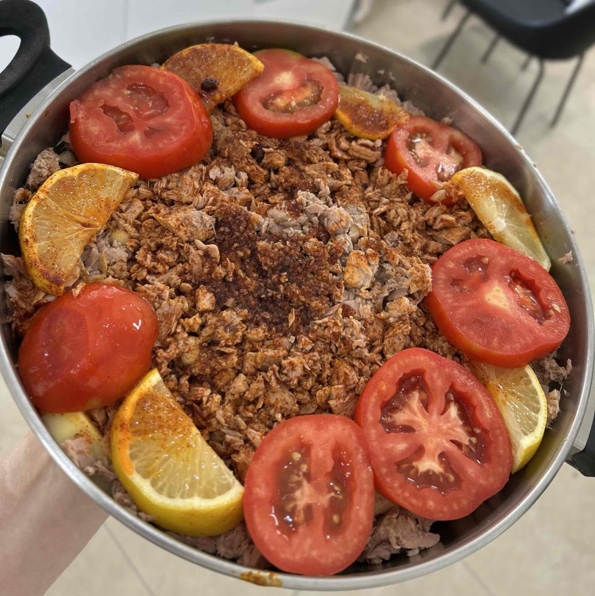 ואז לוקחים כוס של שמן שמים בפנים פפריקה מעט מלח כי כבר הטונה מלוחה ושופכים מעל כל הסיר מניחים על הגז ונותנים לירקות בעיקר לעגבניות להגיר נוזלים .