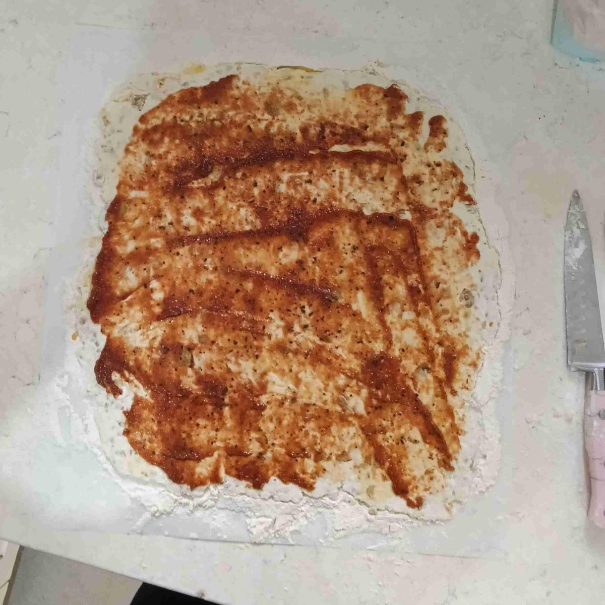 4. ככה נעשה גם עם הכדור השני של הבצק, נרדד לעלה, נחלק ל5-6 חלקים, רק במקום שמן זית אפשר למרוח רסק עגבניות טעים וממעל מוצרלה.