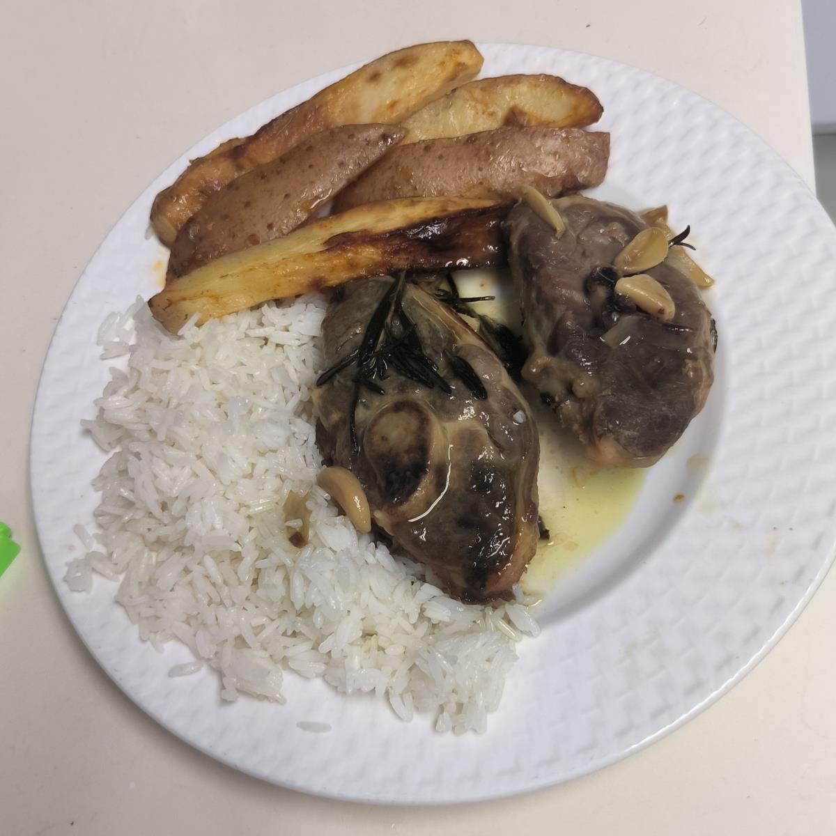 מגישים עם אורז לבן / שעועית מוקפצת / תפוחי אדמה צרובים.