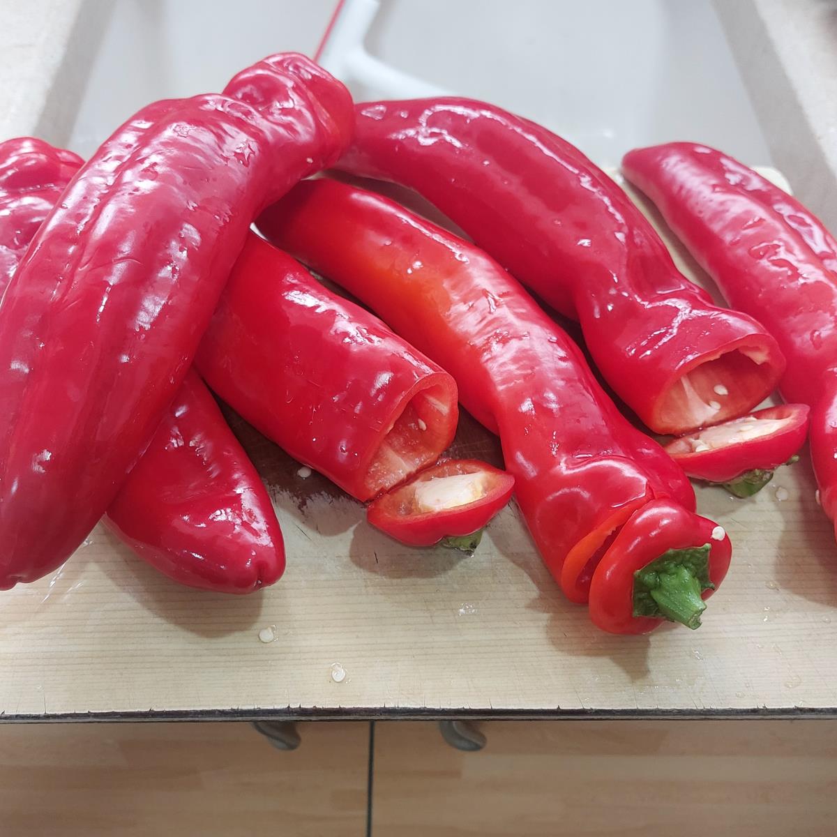 6 פלפלים שושקה נקיים מחרצנים עם החלק העליון חתוך לא עד הסוף. מחובר כמו בתמונה.