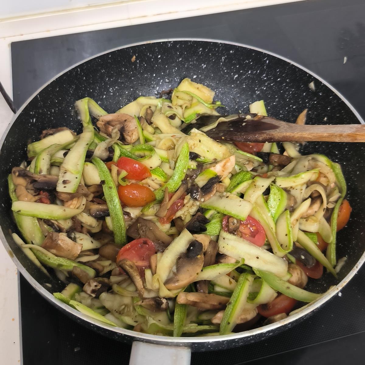 לחמם 3 כפות שמן זית במחבת נון-סטיק, להכניס את העגבניות והפטריות, לאחר דקה להוסיף את השום, לאחר דקה להוסיף את רצועות הקישואים/זוקיני, חום בינוני.